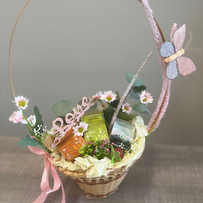 Чайная корзинка состоит из высококачественного, атласным бантом и флористическим декором в виде топера, бабочки и цветов., наивкуснейшего чая. Декорированые бумагой тишью